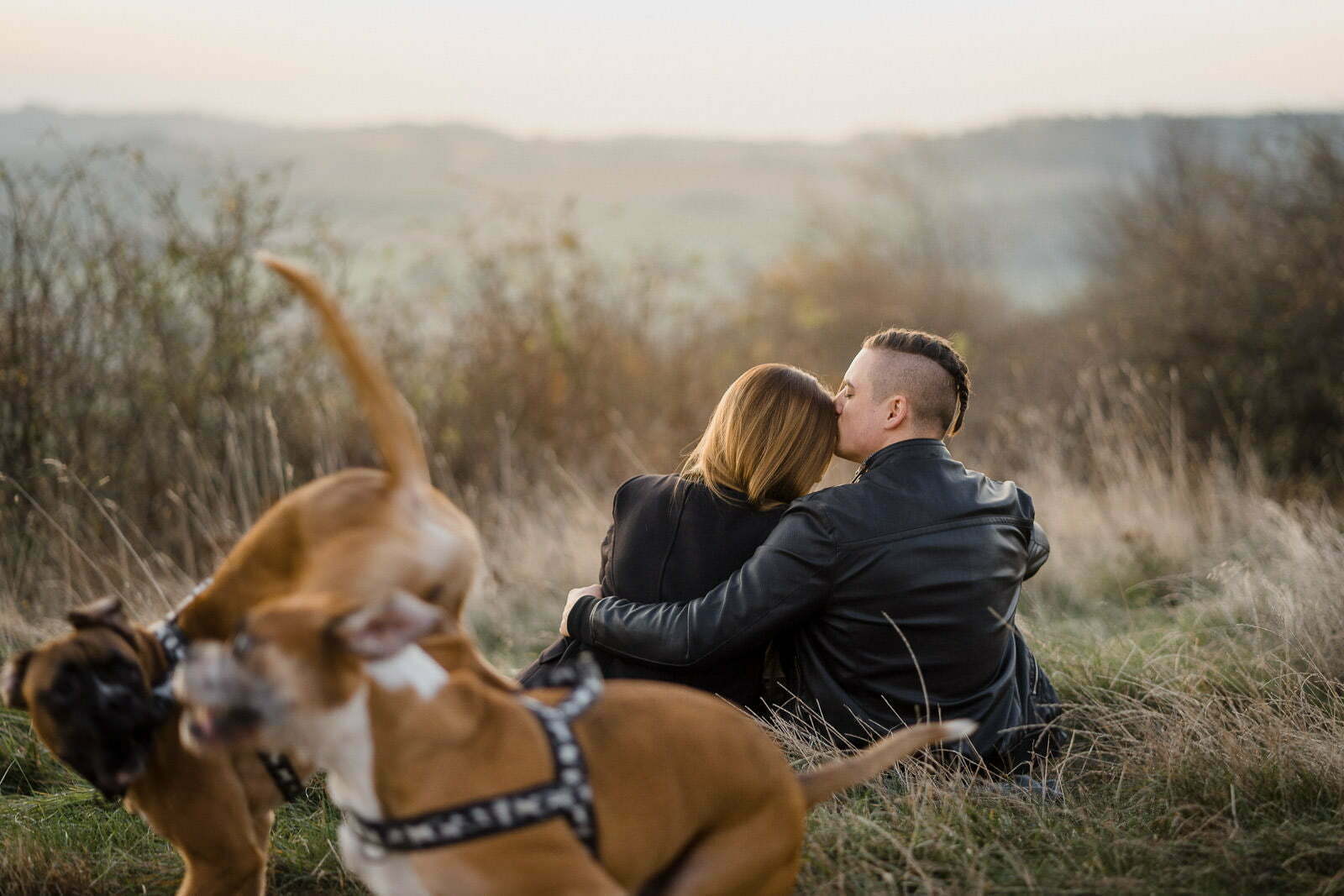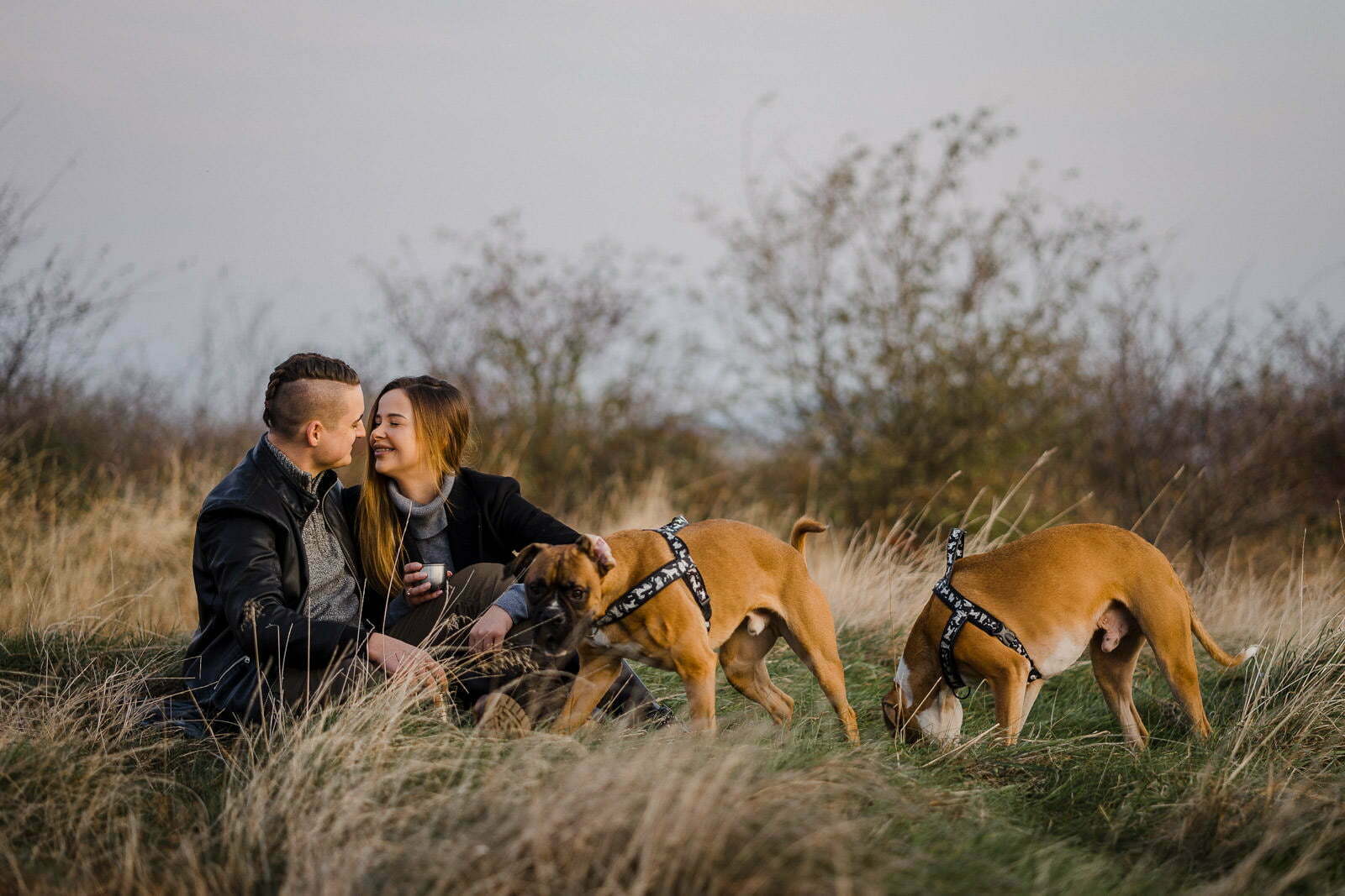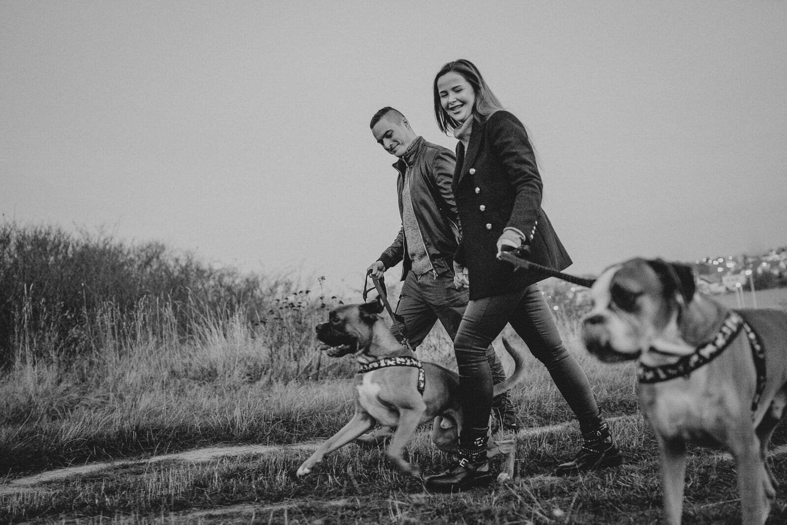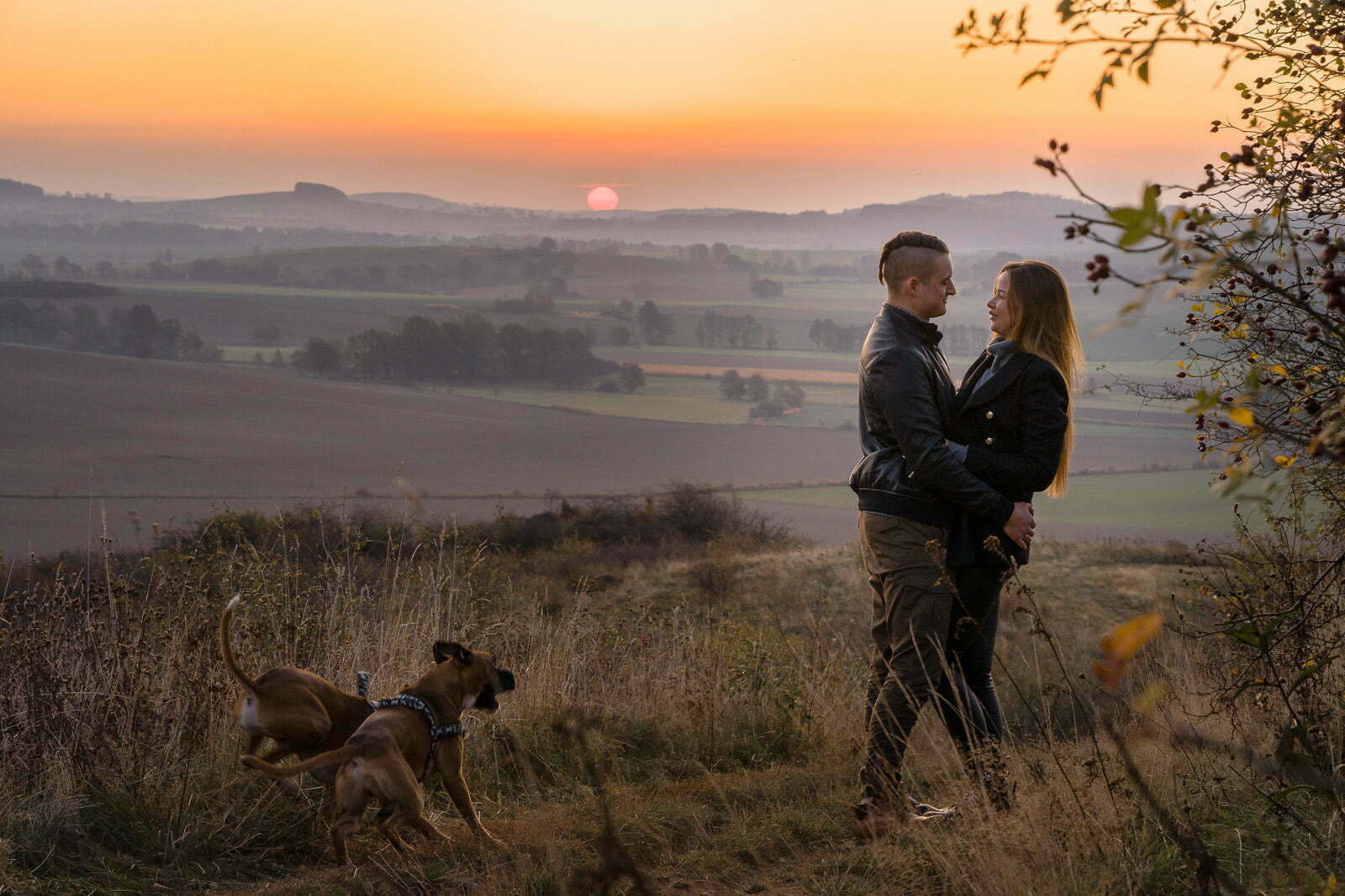 Zawsze podobały mi się zdjęcia o wschodzie słońca. Te specyficzne, miękkie, bajkowe światło, nierzadko w połączeniu z lekką mgiełką jest nie do podrobienia. Dlatego kiedy usłyszałem od Kasi że bardzo chciałaby mieć taką sesję i nie ma problemu ze wstaniem wcześnie rano to od razu zaświeciły mi się oczka i już w głowie miałem pewne miejsce a konkretnie Łysą Górę w Bielawie Kasia i Tomek na sesje zabrali swoje ,,dzieci” czyli dwa rozbrykane pieski których rozpierała energia i co jakiś czas Kasia musiała srogim tonem je uspokajać. Gdy weszliśmy na samą górę słońce zaczęło akurat pojawiać się nad horyzontem co dla mnie było niecodziennym widokiem.To było to na co czekałem! Dałem wskazówkę Kasi i Tomkowi by skupili się na sobie i wyobrazili że są tylko sami, co z resztą bardzo naturalnie im wyszło. Jakie były efekty tego spotkania? Zobaczcie sami!