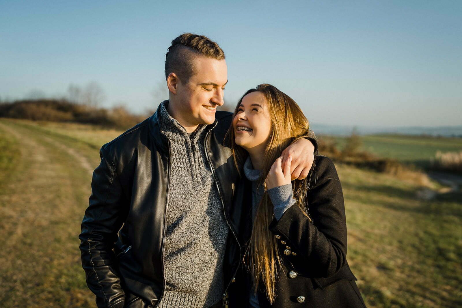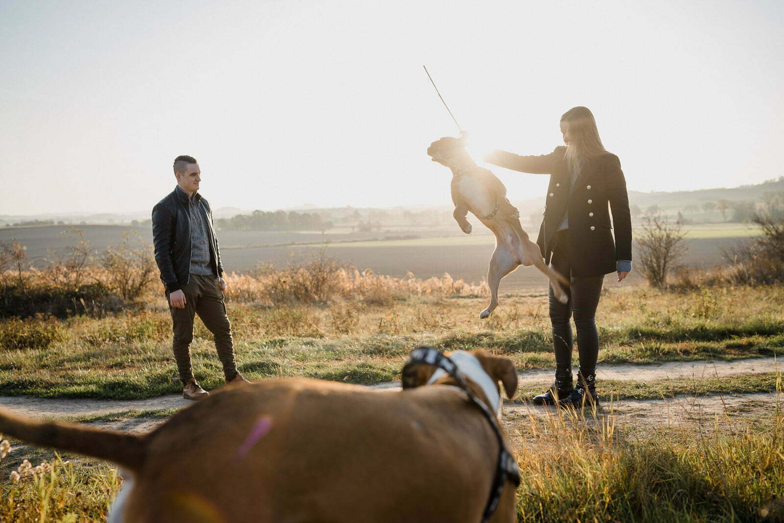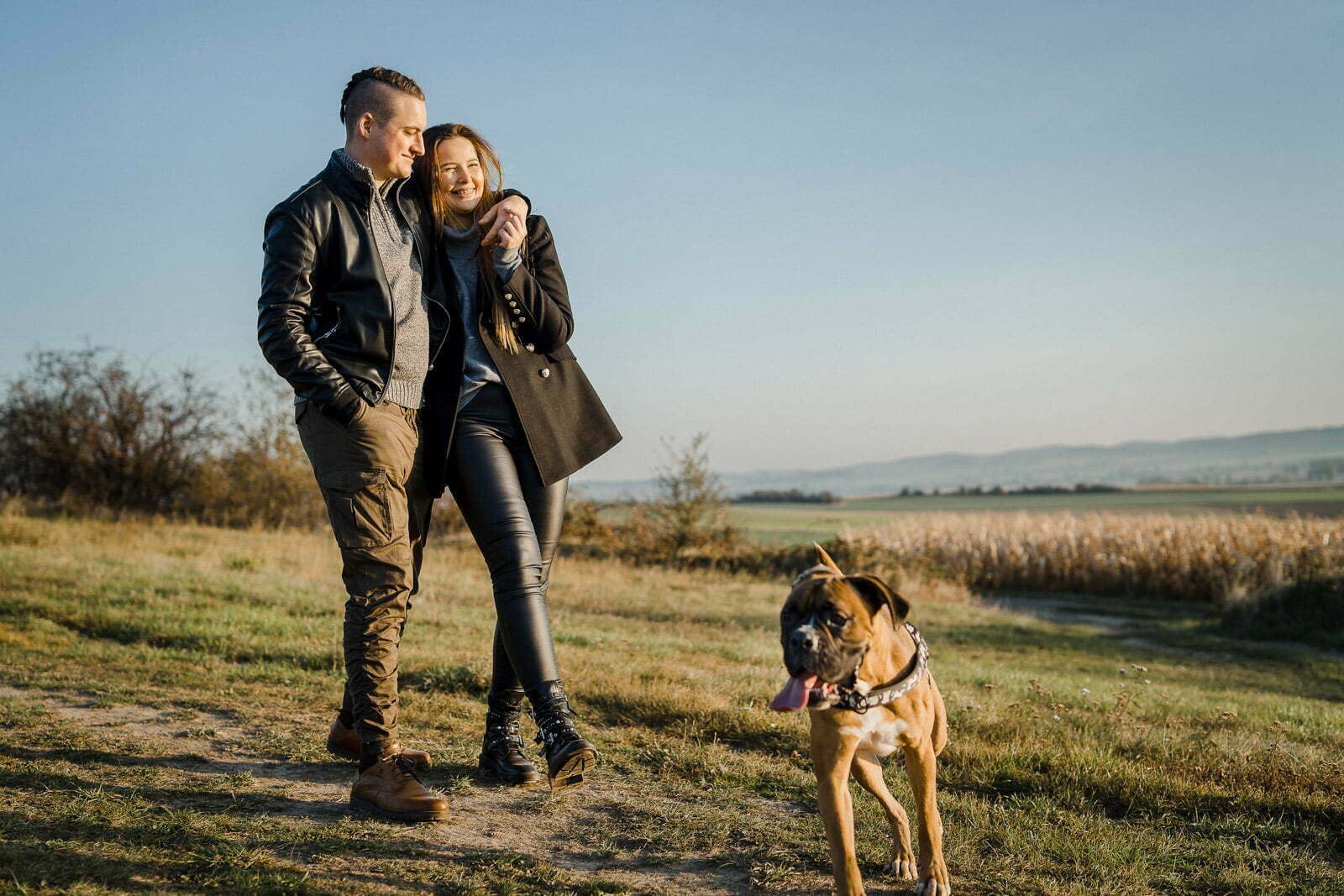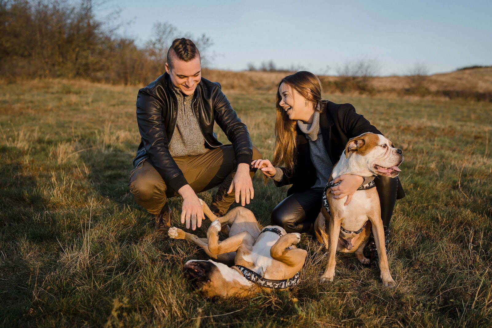 Zawsze podobały mi się zdjęcia o wschodzie słońca. Te specyficzne, miękkie, bajkowe światło, nierzadko w połączeniu z lekką mgiełką jest nie do podrobienia. Dlatego kiedy usłyszałem od Kasi że bardzo chciałaby mieć taką sesję i nie ma problemu ze wstaniem wcześnie rano to od razu zaświeciły mi się oczka i już w głowie miałem pewne miejsce a konkretnie Łysą Górę w Bielawie Kasia i Tomek na sesje zabrali swoje ,,dzieci” czyli dwa rozbrykane pieski których rozpierała energia i co jakiś czas Kasia musiała srogim tonem je uspokajać. Gdy weszliśmy na samą górę słońce zaczęło akurat pojawiać się nad horyzontem co dla mnie było niecodziennym widokiem.To było to na co czekałem! Dałem wskazówkę Kasi i Tomkowi by skupili się na sobie i wyobrazili że są tylko sami, co z resztą bardzo naturalnie im wyszło. Jakie były efekty tego spotkania? Zobaczcie sami!